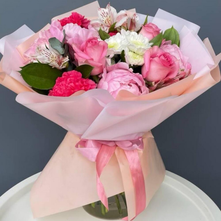 На фото букет «игра нежности». В составе: пион 5 шт, хризантема кустовая 2 шт, роза 5 шт, гвоздика 3 шт, рускус 3 шт, дизайнерская упаковка 1 шт, атласная лента 1 шт, . Все цветы свежие и ароматные, букет красиво оформлен и отлично подходит для подарка. Доступна доставка цветов или самовывоз.